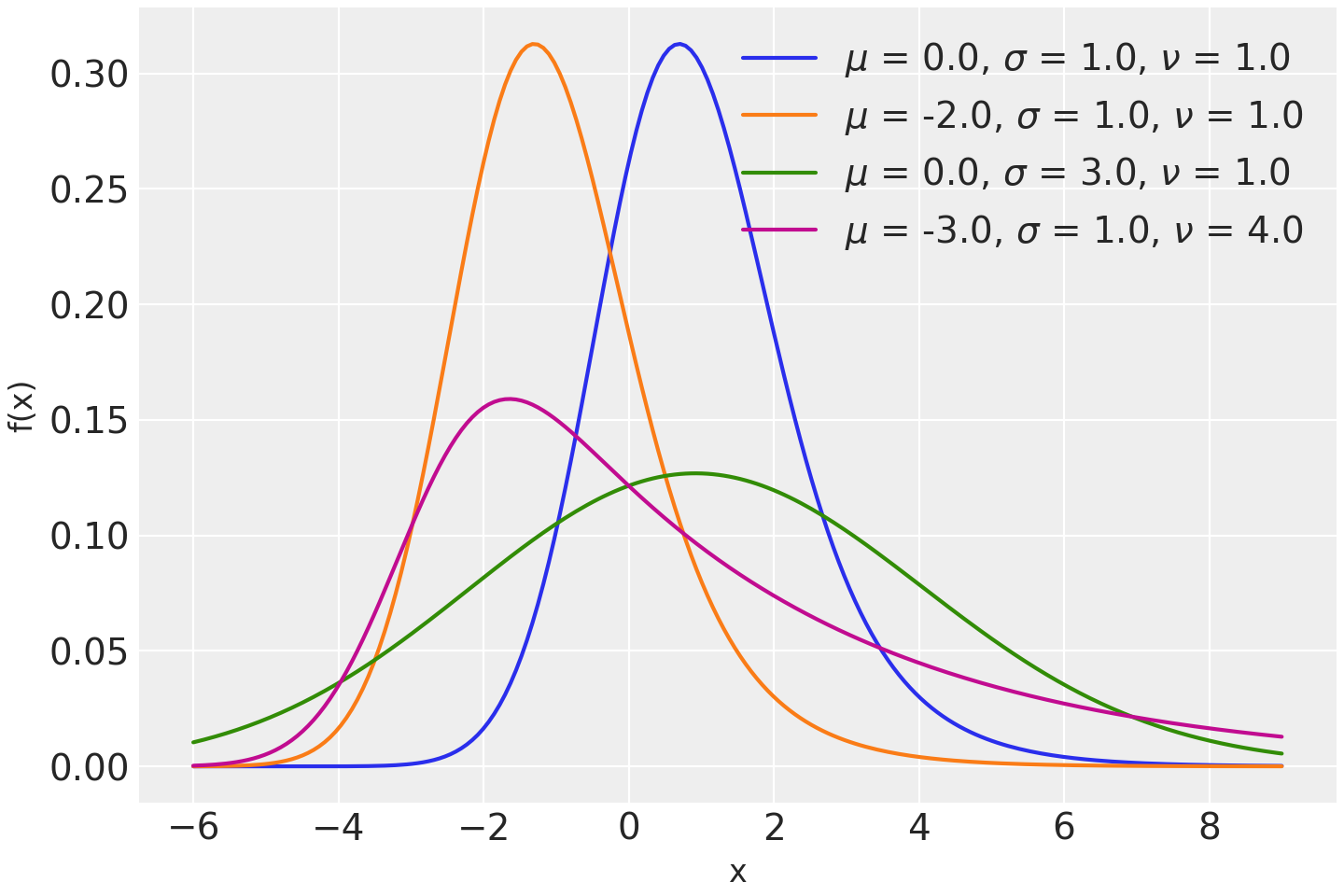 \[f(x \mid \mu, \sigma, \tau) = \frac{1}{\nu}\; \exp\left\{\frac{\mu-x}{\nu}+\frac{\sigma^2}{2\nu^2}\right\} \Phi\left(\frac{x-\mu}{\sigma}-\frac{\sigma}{\nu}\right)\]where \(\Phi\) is the cumulative distribution function of the standard normal distribution.