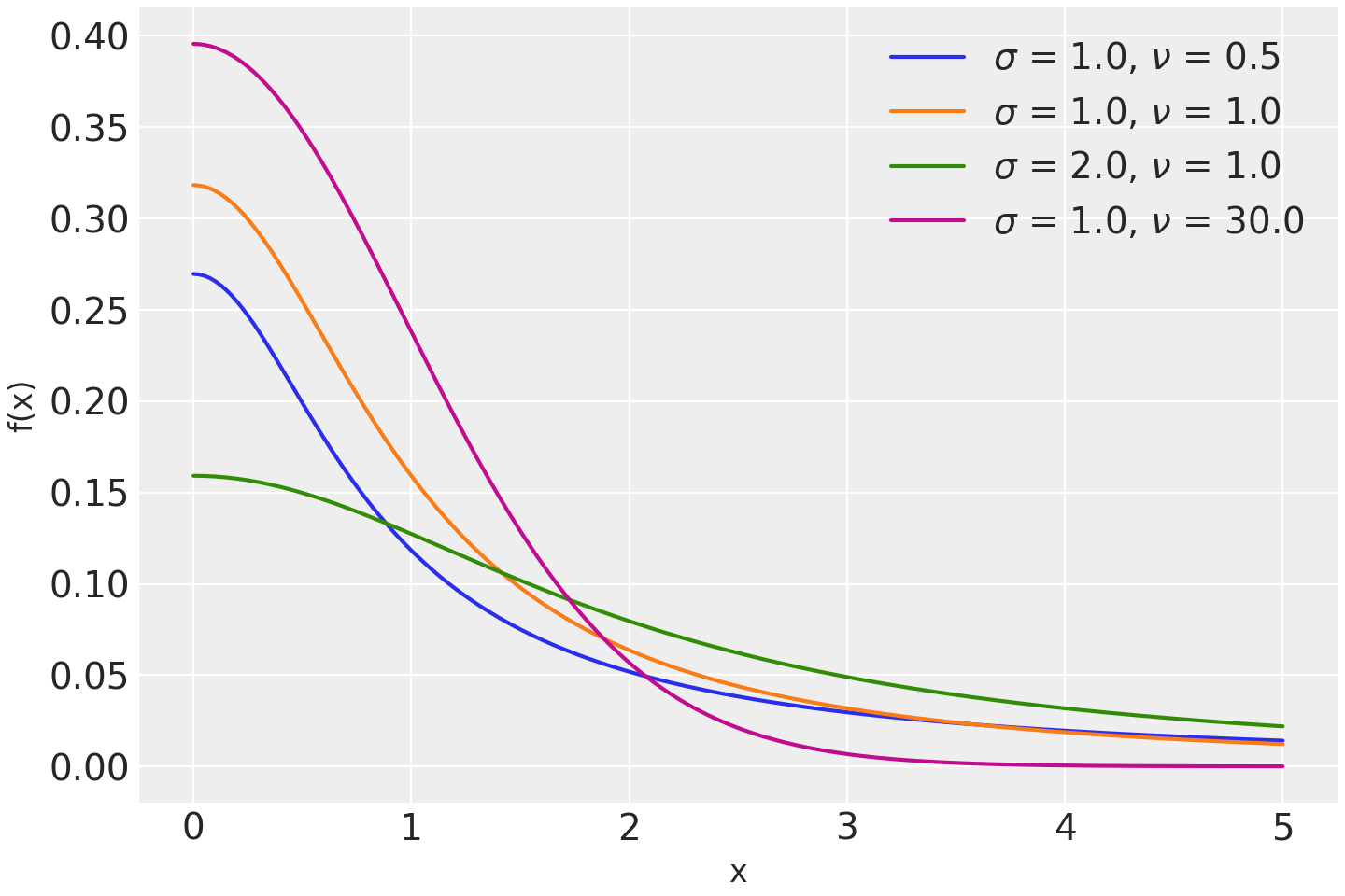 # Only pass in one of lam or sigma, but not both. with pm.Model(): x = pm.HalfStudentT("x", sigma=10, nu=10) with pm.Model(): x = pm.HalfStudentT("x", lam=4, nu=10)