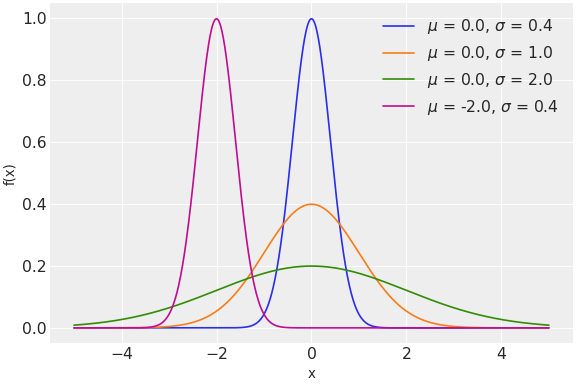 \[f(x \mid \mu, \tau) = \sqrt{\frac{\tau}{2\pi}} \exp\left\{ -\frac{\tau}{2} (x-\mu)^2 \right\}\]Normal distribution can be parameterized either in terms of precision or standard deviation. The link between the two parametrizations is given by
