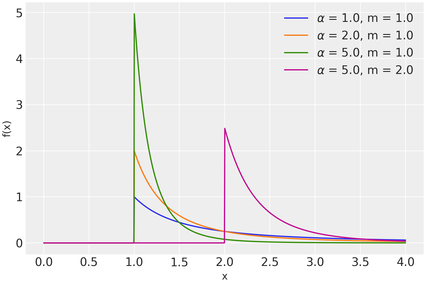 \[f(x \mid \alpha, m) = \frac{\alpha m^{\alpha}}{x^{\alpha+1}}\](