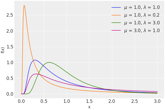 \[f(x \mid \mu, \lambda) = \left(\frac{\lambda}{2\pi}\right)^{1/2} x^{-3/2} \exp\left\{ -\frac{\lambda}{2x}\left(\frac{x-\mu}{\mu}\right)^2 \right\}\](